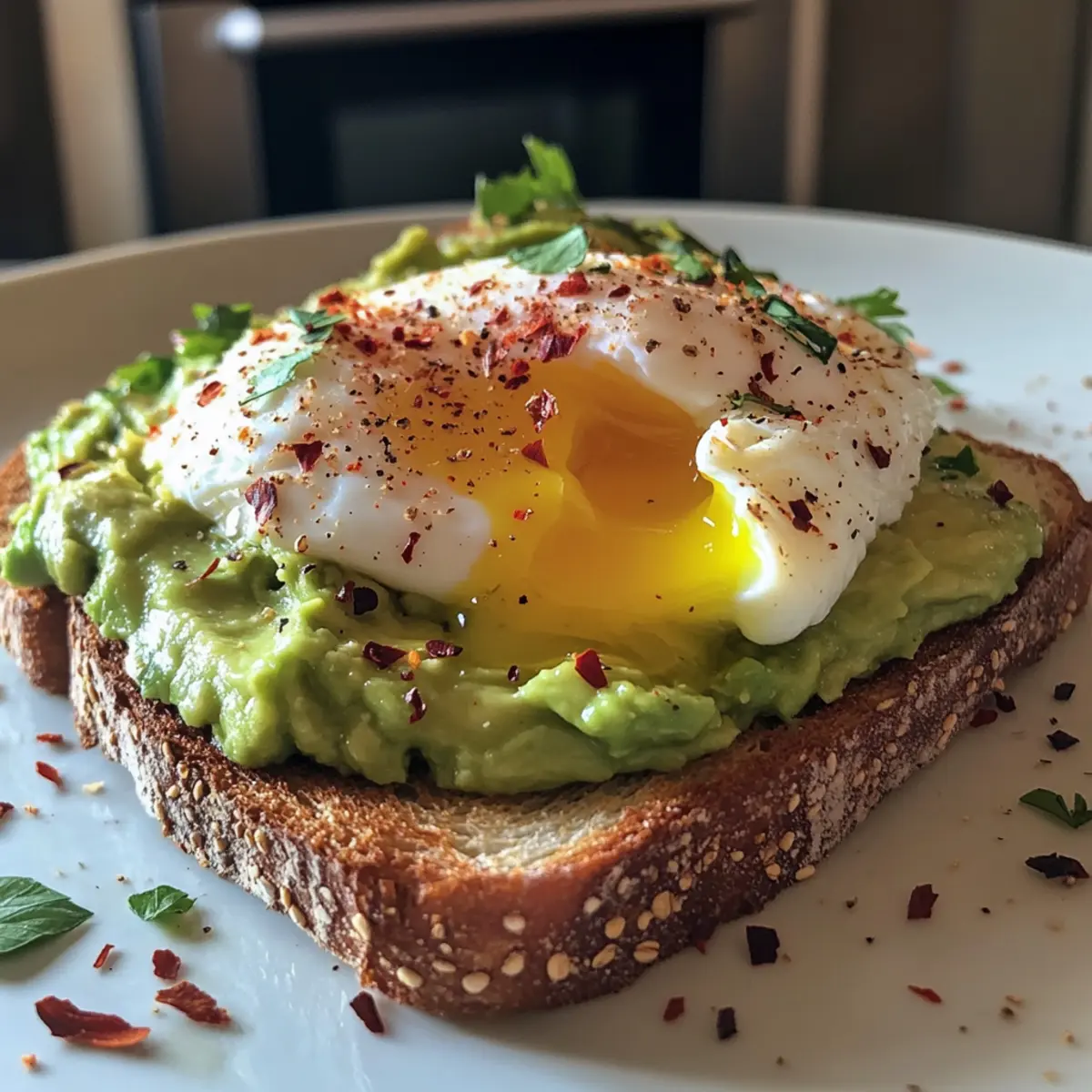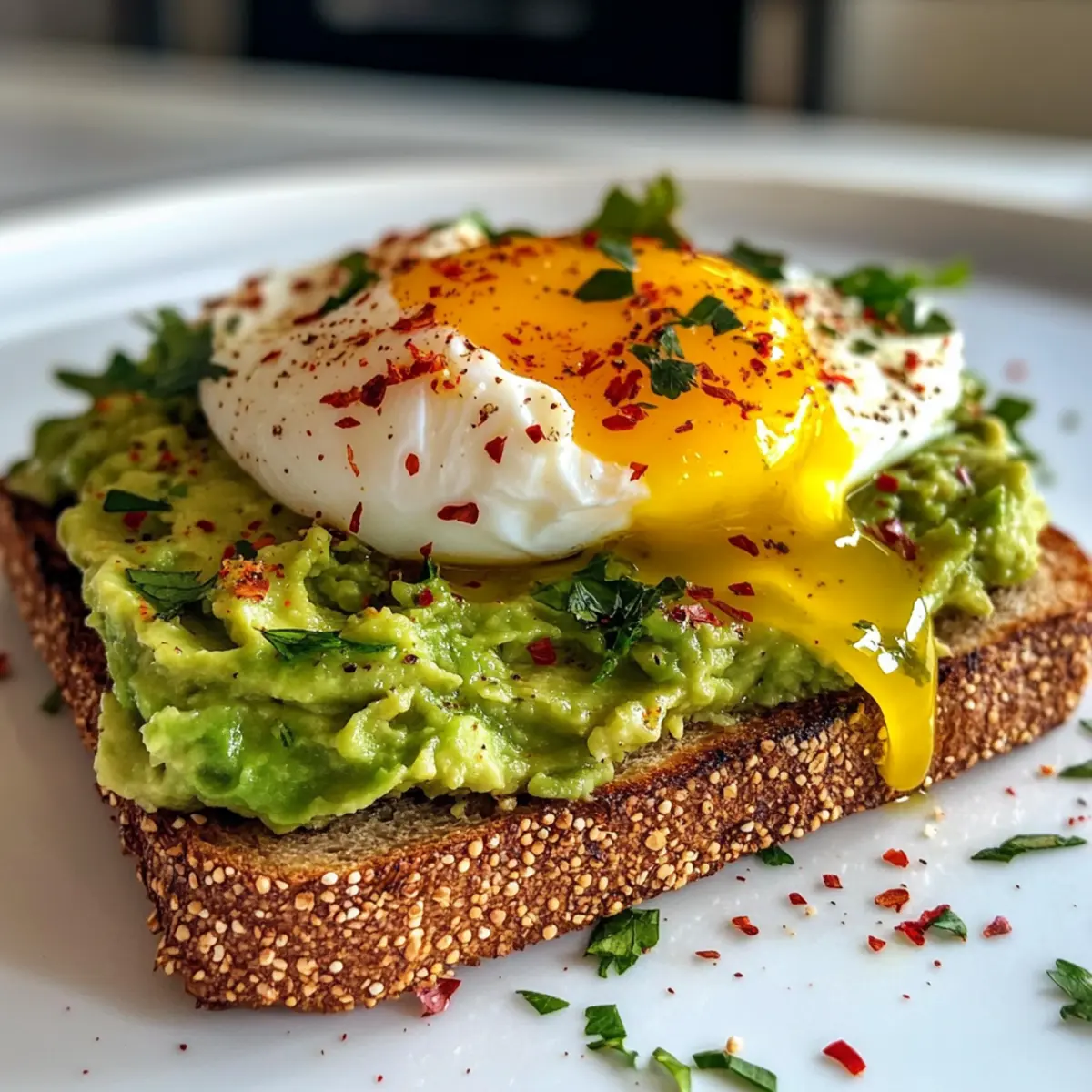 Top each avocado toast with a poached egg, and sprinkle with red pepper flakes for a hint of spice. Add your choice of fresh herbs, such as cilantro or parsley, to bring brightness to the dish. Serve immediately while warm to relish the combination of textures in your Avocado Toast with Poached Egg.