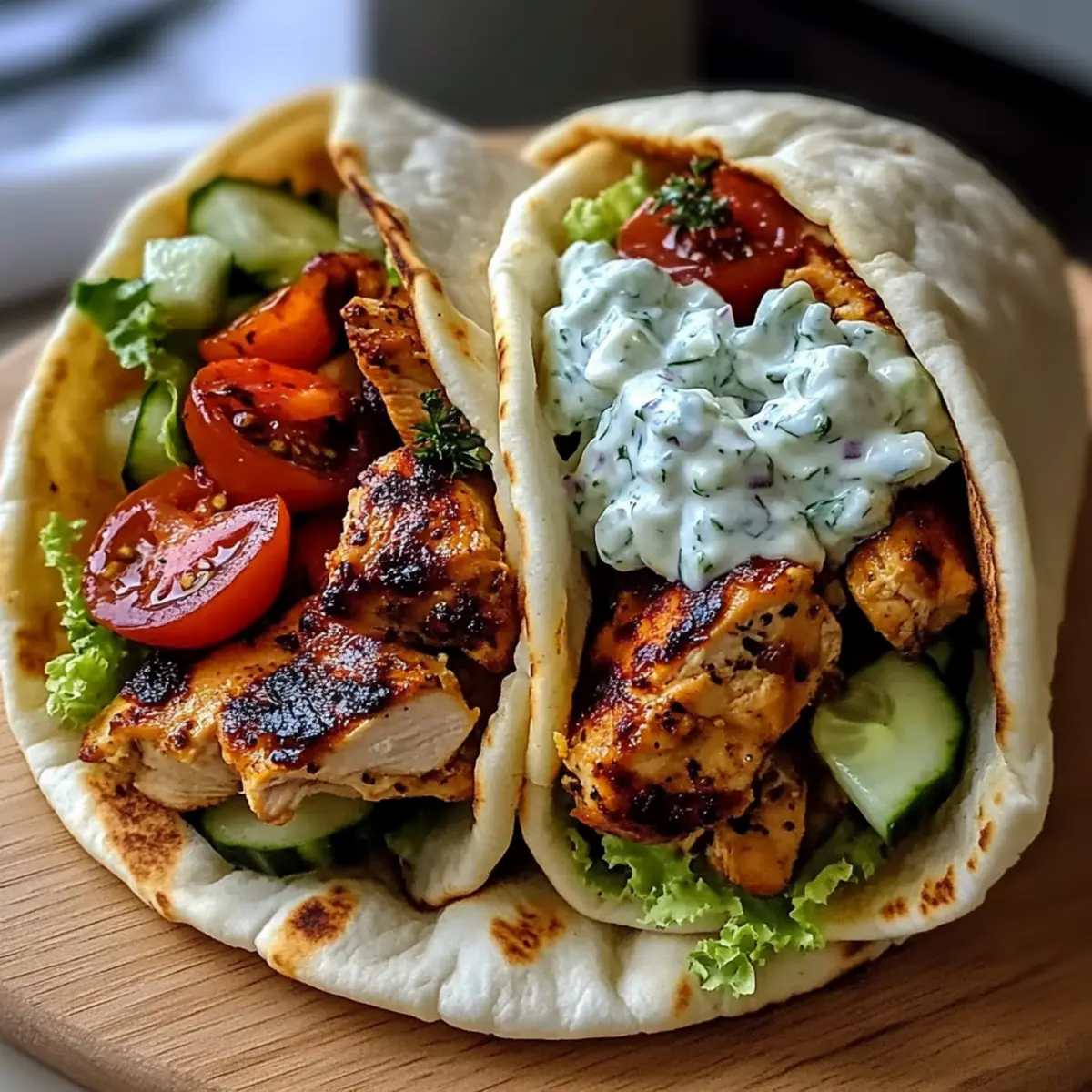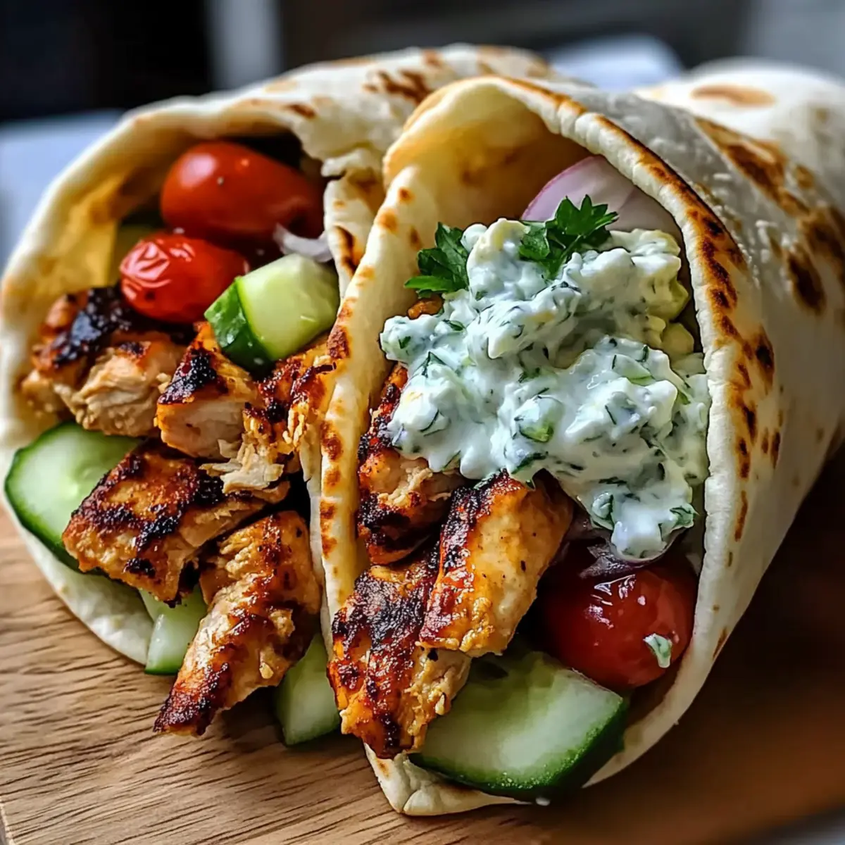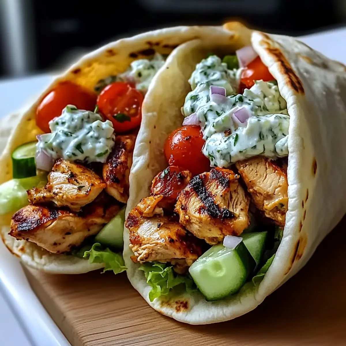 Once the chicken is cooked, let it rest for a few minutes before slicing it into thin strips. Warm the pita bread slightly in the skillet or microwave for 10-15 seconds. Spread a generous layer of the creamy feta tzatziki on each pita, then add the sliced chicken and top with fresh cherry tomatoes, cucumber, and red onion. Roll the pitas tightly for serving.
