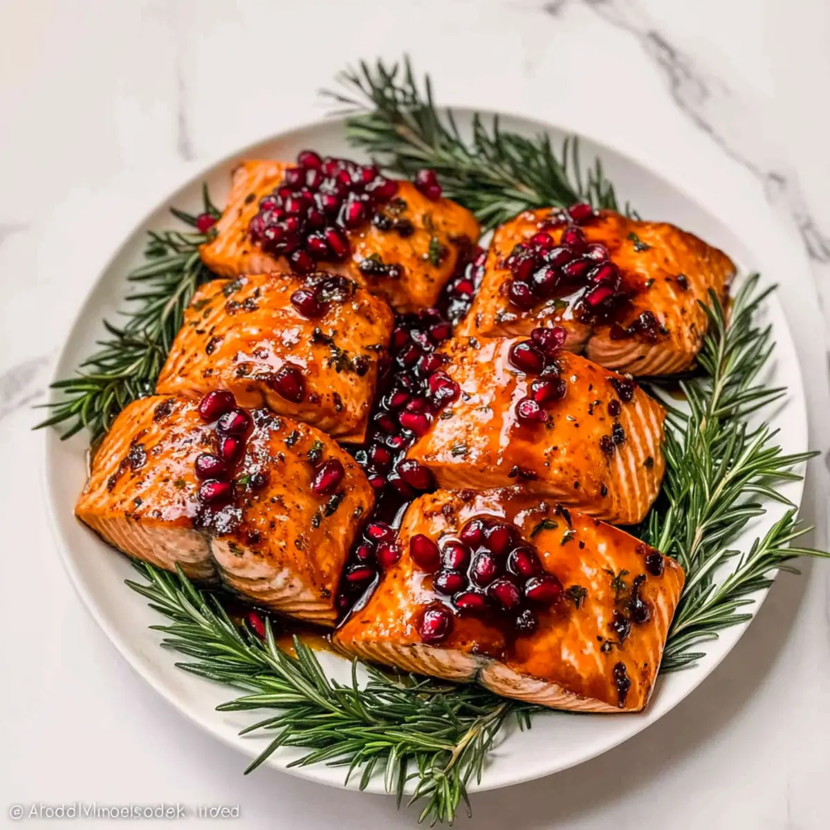 - Remove the salmon from the oven and garnish with fresh pomegranate seeds and rosemary sprigs before serving.