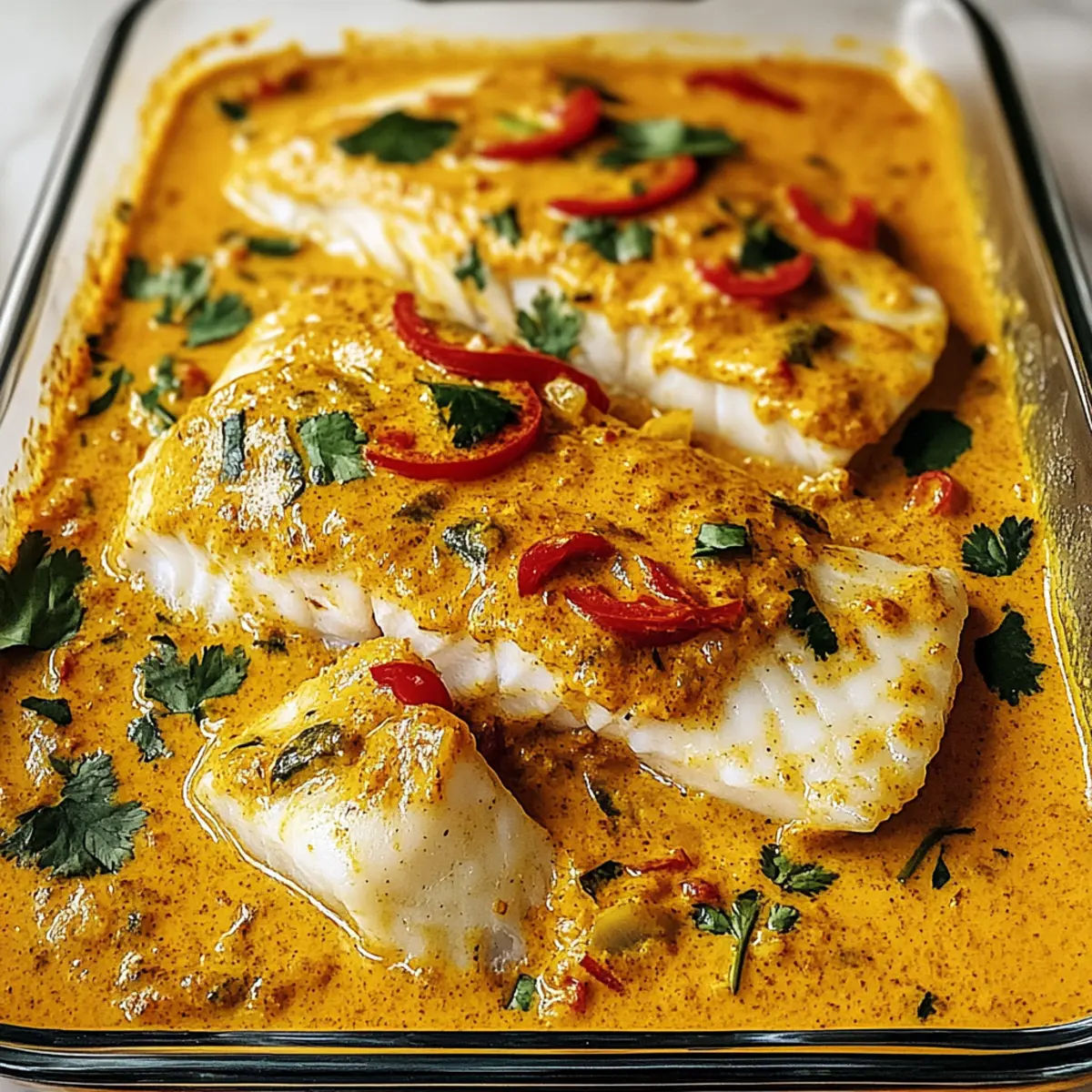 - Arrange cod fillets in the baking dish, season with salt and pepper. Pour the coconut curry sauce over the cod.
