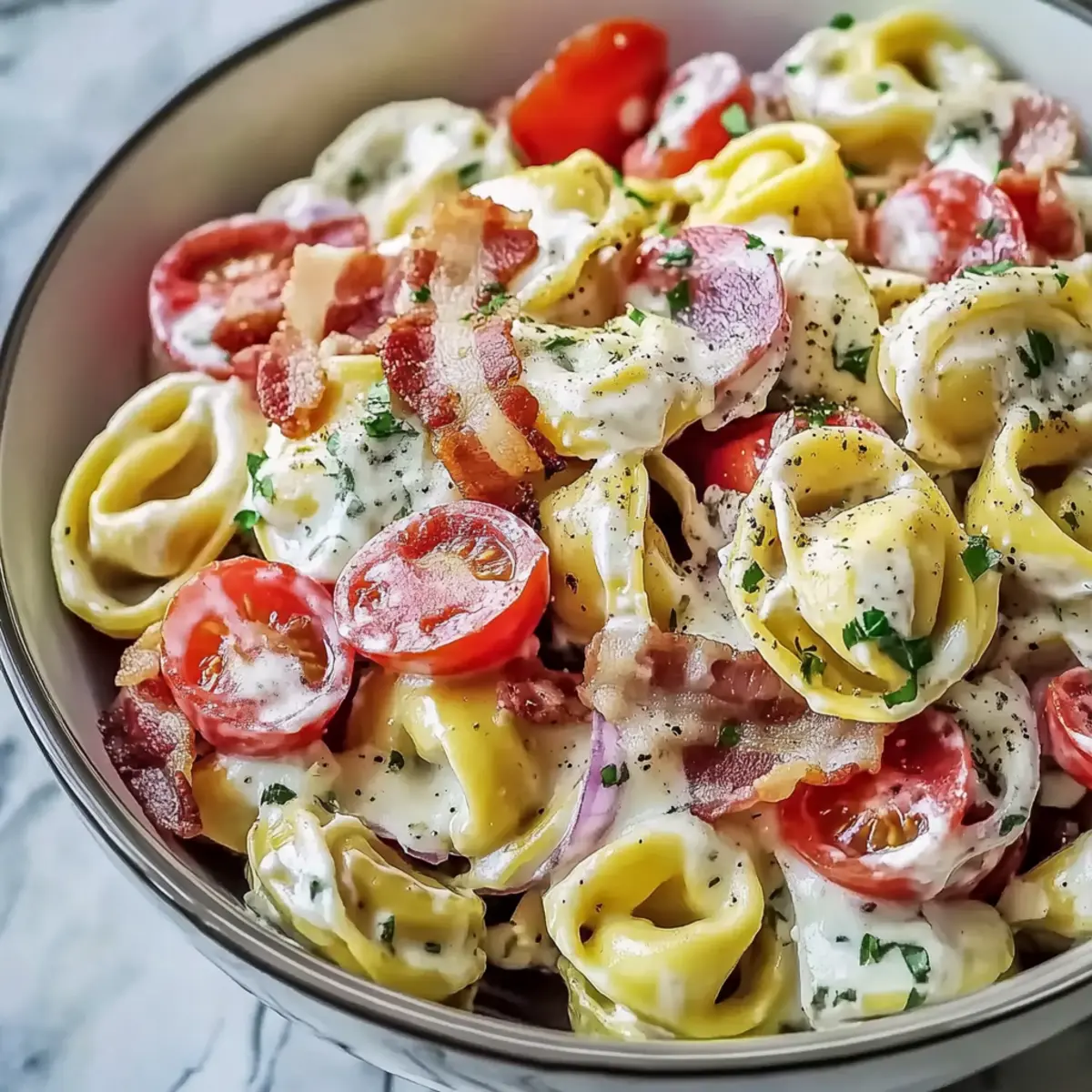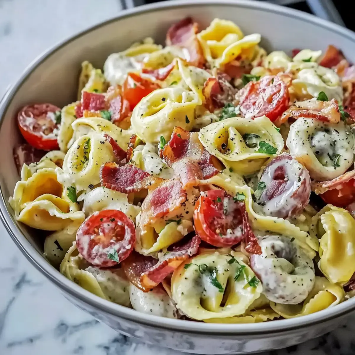 - Add cooked tortellini, chopped bacon, pepperoncini, Parmesan cheese, diced red onion, and sliced tomatoes to the bowl. Toss gently to coat.