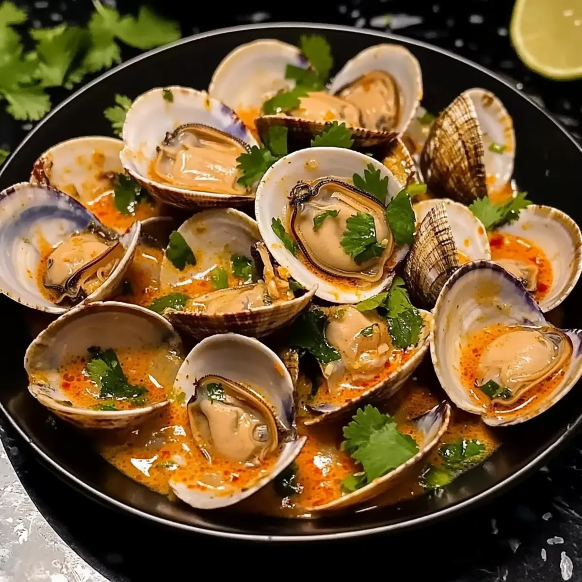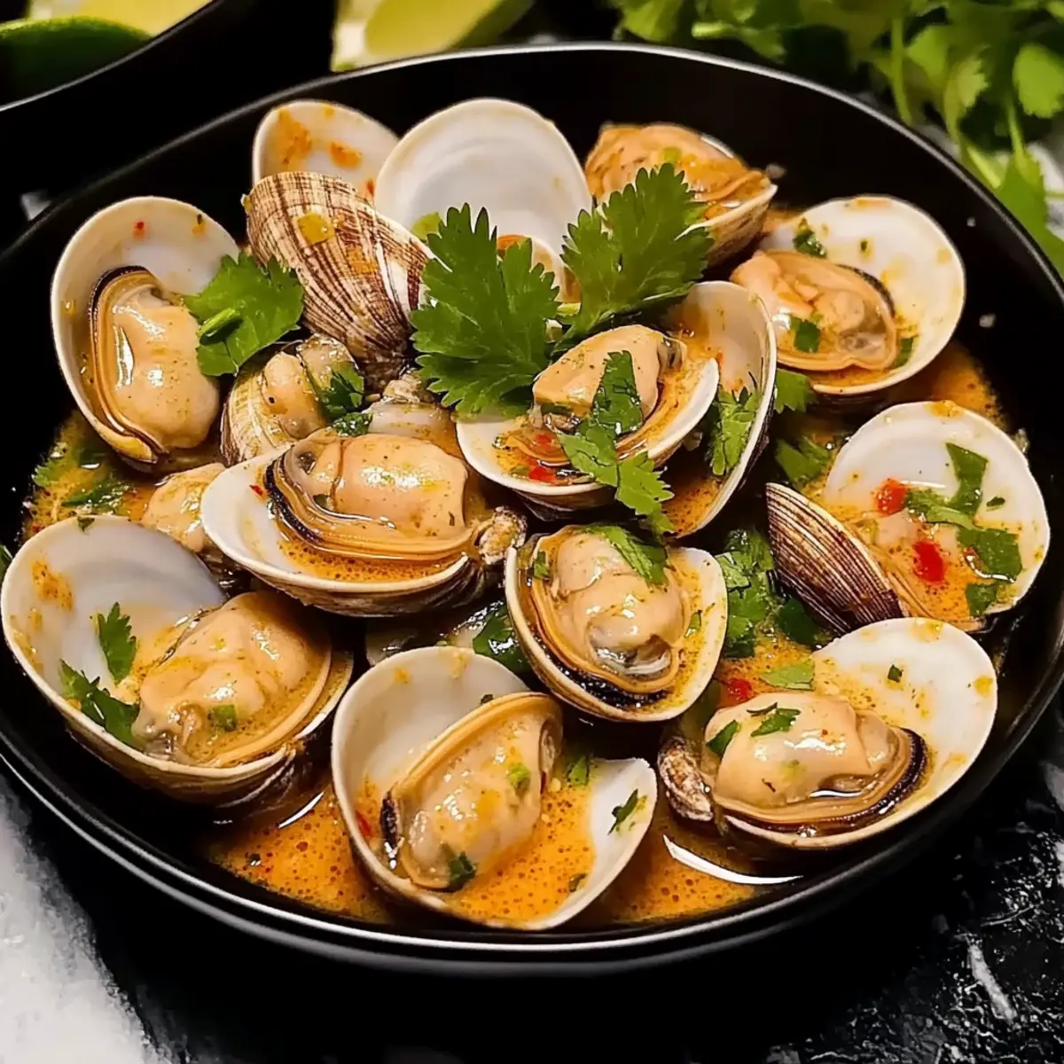 Once the clams are steamed to perfection, remove the pot from heat and garnish with a handful of freshly chopped cilantro. Serve your Ginger Infused Steamed Clams immediately, accompanied by lime wedges and crusty bread or rice for soaking up the delicious broth. Delight in the vibrant colors and aromas that fill your kitchen!