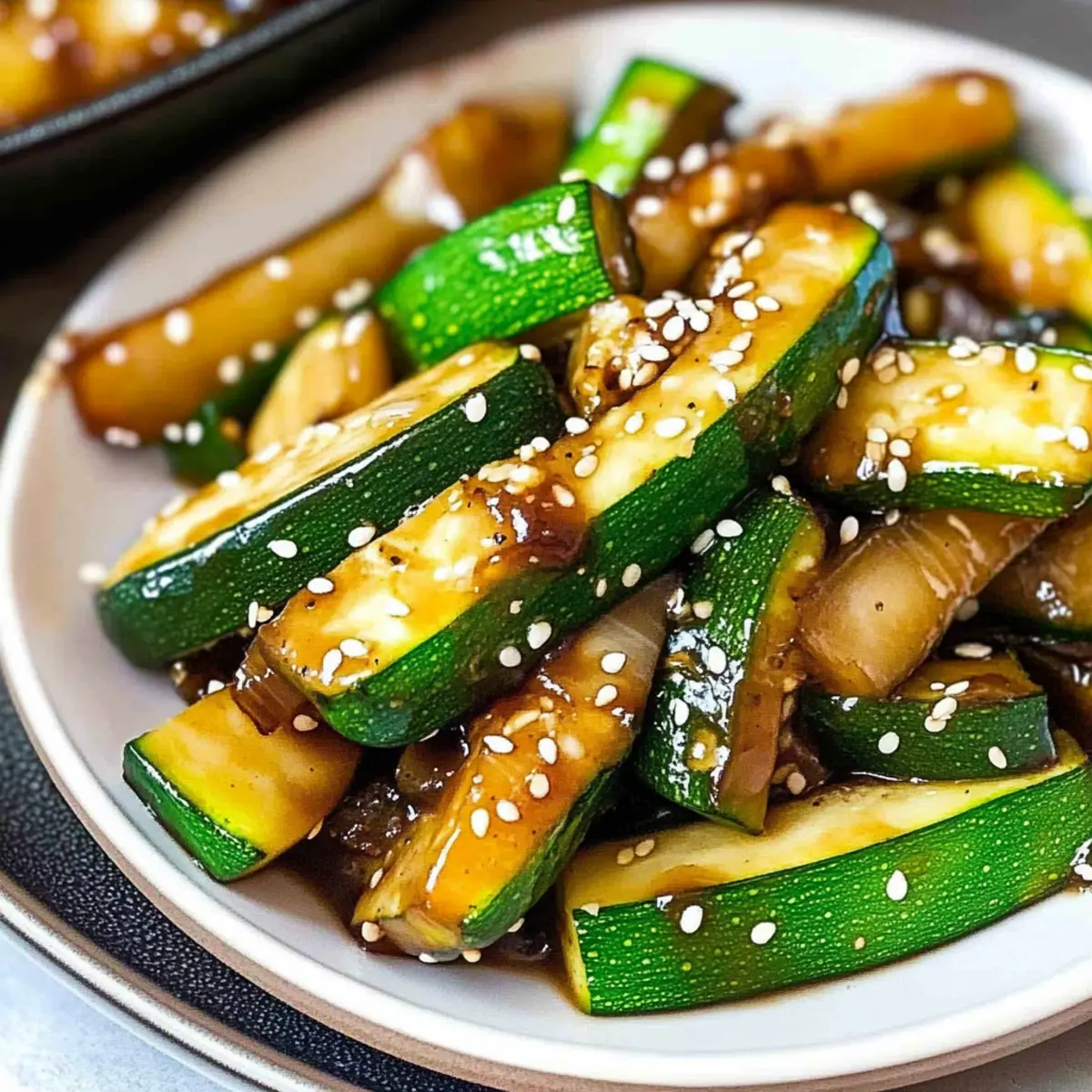 Pour in the soy sauce and sesame oil, then season with a pinch of salt, black pepper, and sprinkle sesame seeds on top. Sauté everything together for another minute until the veggies are well-coated and tender-crisp. The flavors should meld beautifully, creating a savory glaze on your Hibachi Zucchini.