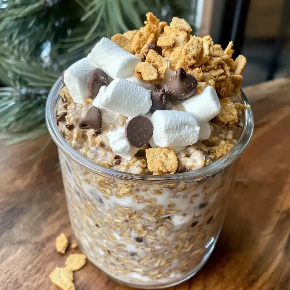- In the morning, spoon the oats into bowls and top with whipped cream, mini chocolate chips, crushed graham crackers, and mini marshmallows.
