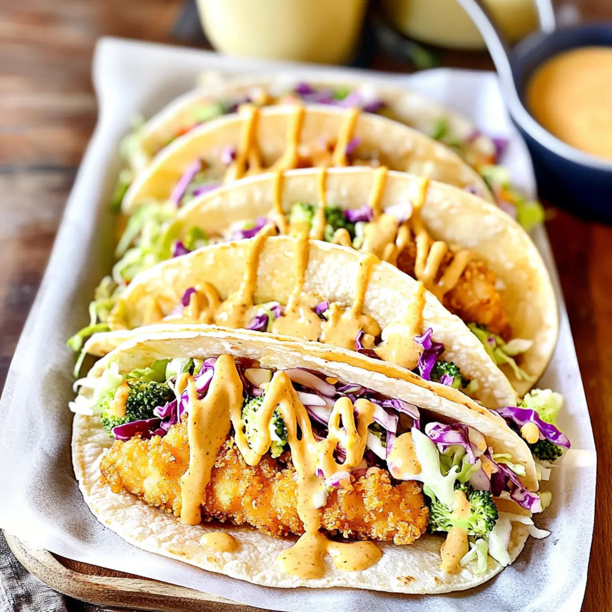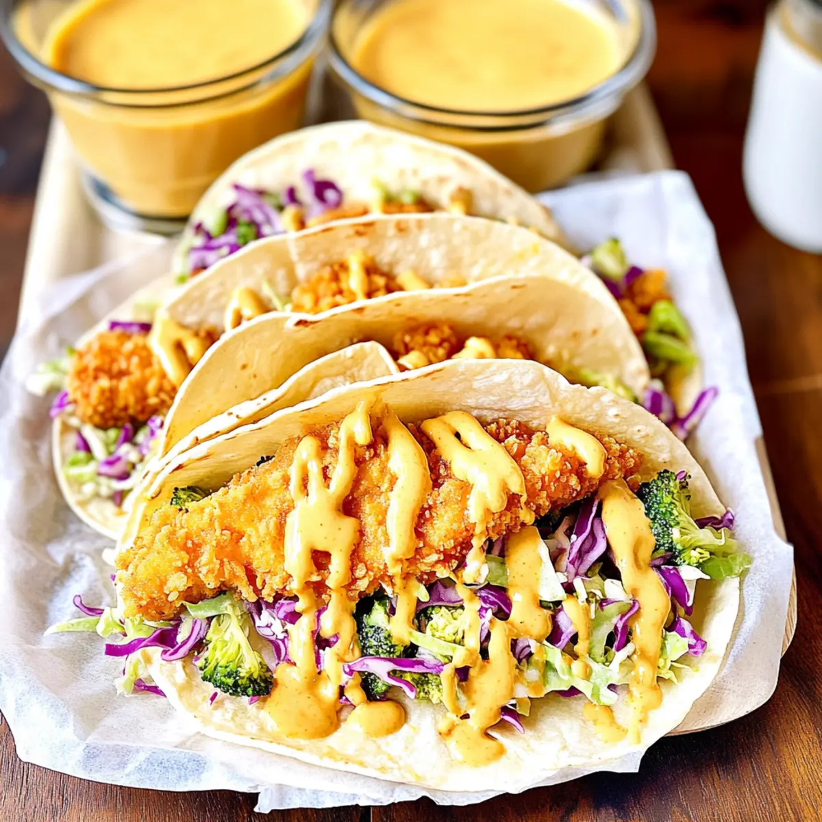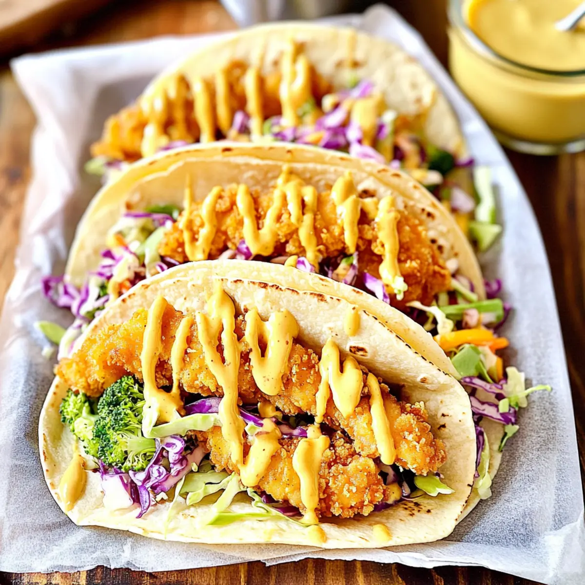 - Assemble the tacos by placing two chicken strips on each tortilla, topping with broccoli slaw, and drizzling with keto honey mustard sauce.