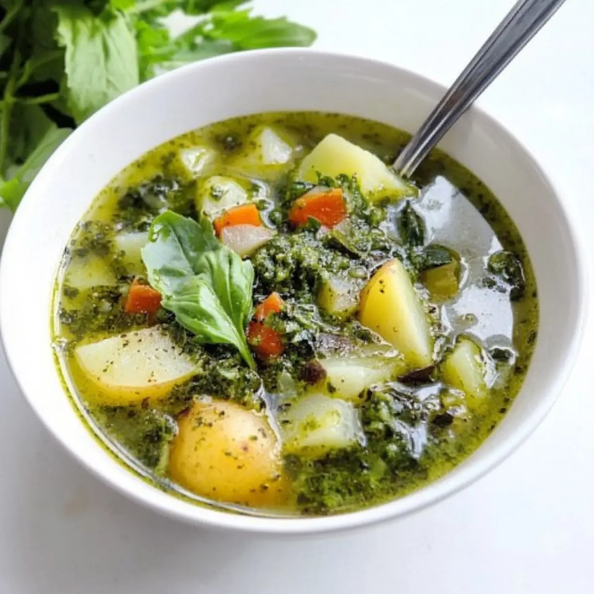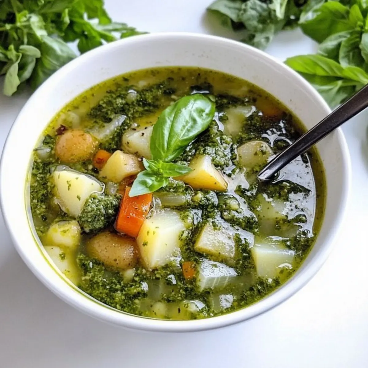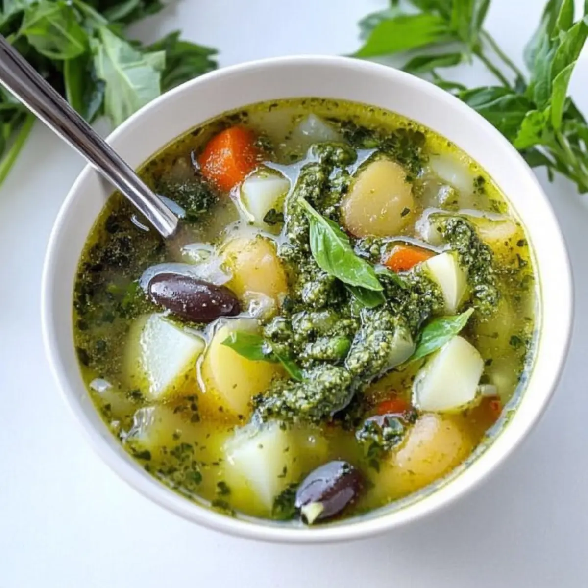 To serve, ladle the hearty Italian green minestrone soup into bowls and top each portion with a generous spoonful of the fresh basil pesto. This final burst of flavor not only enhances the soup but also creates a beautiful presentation. Pair with crusty bread for a complete meal that’s sure to warm hearts.