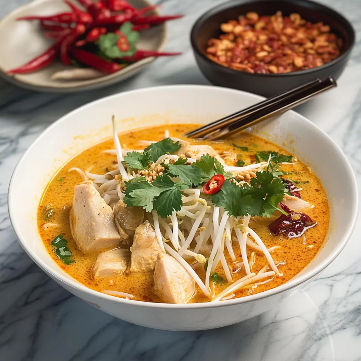 In serving bowls, place a generous portion of the cooked noodles at the bottom. Carefully pour the rich, flavorful spicy laksa noodle soup over the noodles, ensuring an even distribution of chicken and broth. Garnish each bowl with fresh bean sprouts, cilantro, red chilies, and serve with extra chili sauce for that added zing.