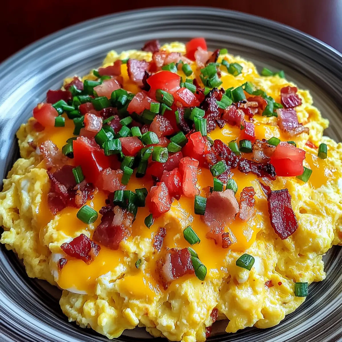 Spoon your loaded scrambled eggs onto serving plates immediately while hot, garnishing with freshly chopped chives and optional hot sauce for those who like a kick. The vibrant colors and rich flavors make this hearty breakfast a visual delight, ready to enjoy straight away.