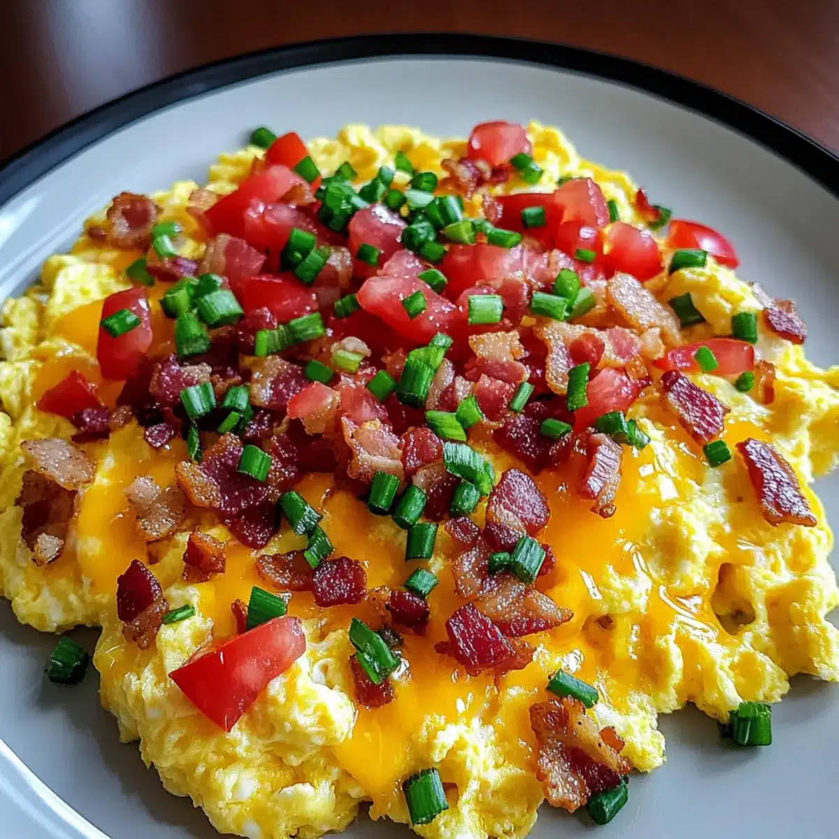 Ultimate Flavor Explosion: Each bite of these loaded scrambled eggs is brimming with savory goodness, thanks to the harmony of cheddar cheese, crispy bacon, and fresh veggies.