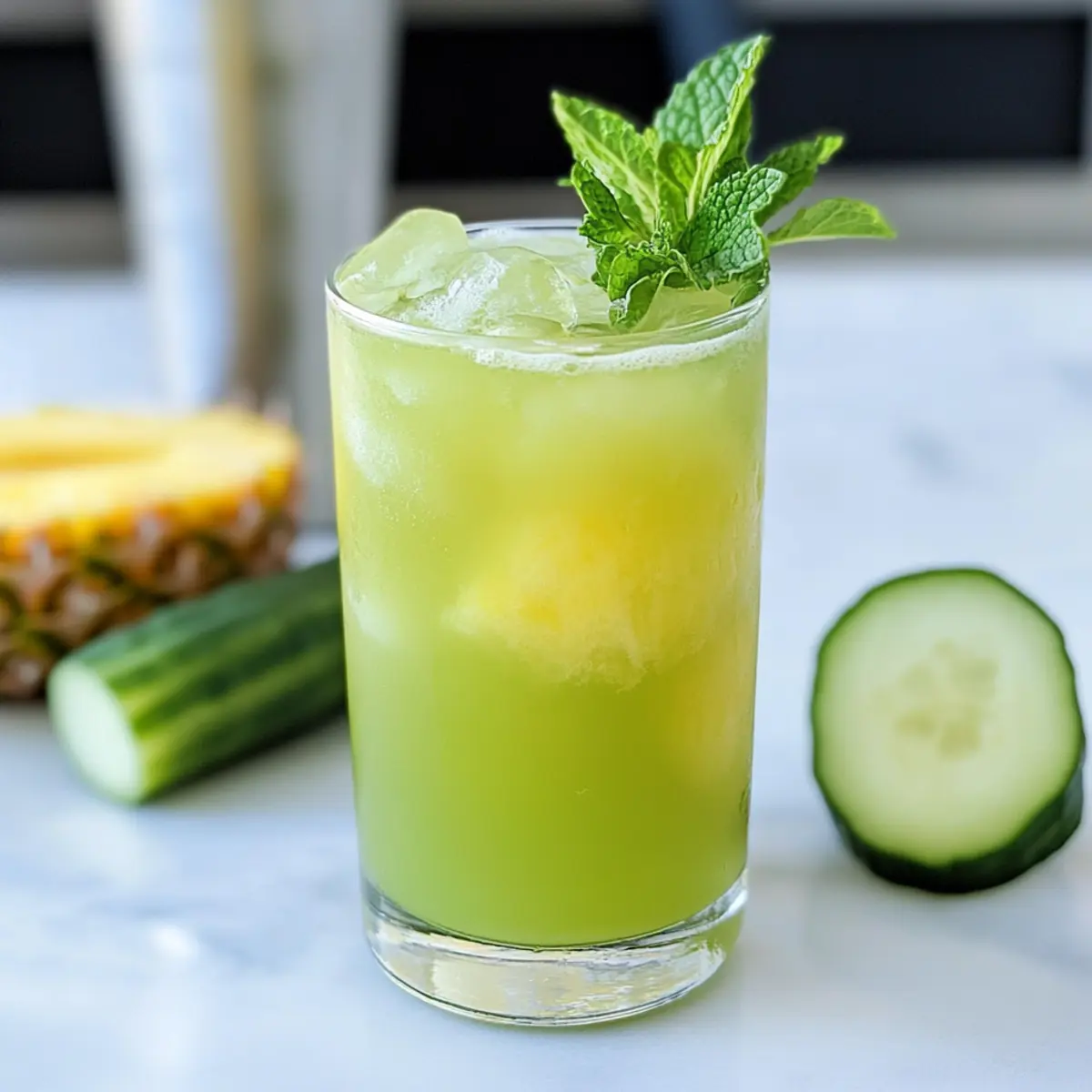 - Blend the Ingredients: In a high-speed blender, combine the chopped cucumber, pineapple chunks, lime juice, peeled ginger, and mint leaves. Add 2-3 cups of cold water. Blend on high for 30-45 seconds until smooth.