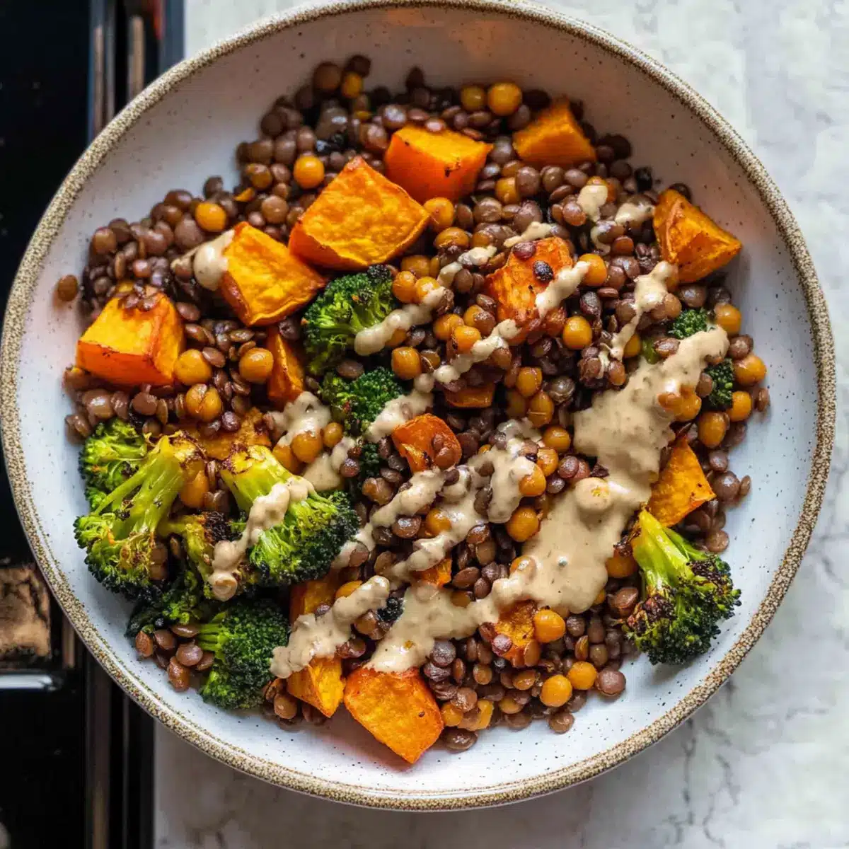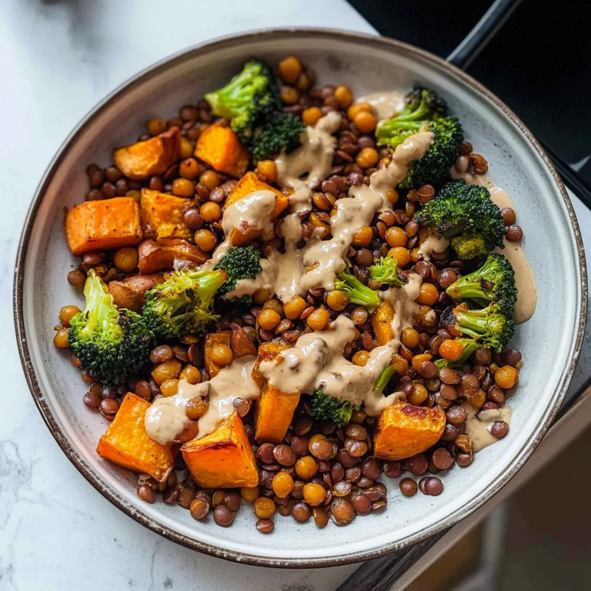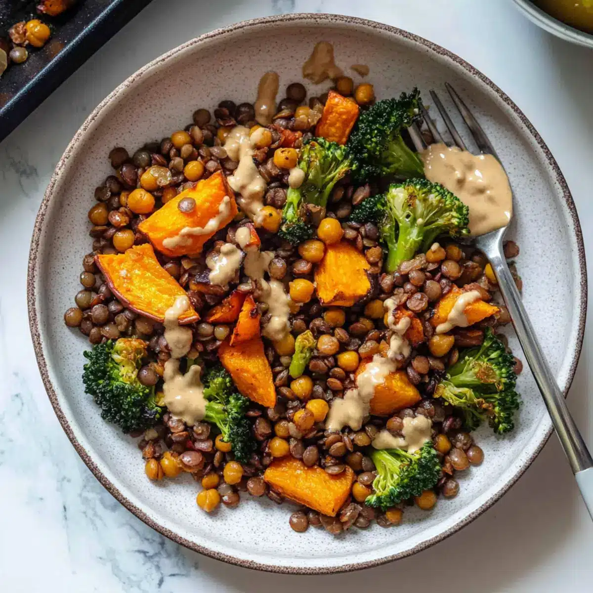 Roasted Lentils Sheet Pan Meal with Maple Tahini Bliss