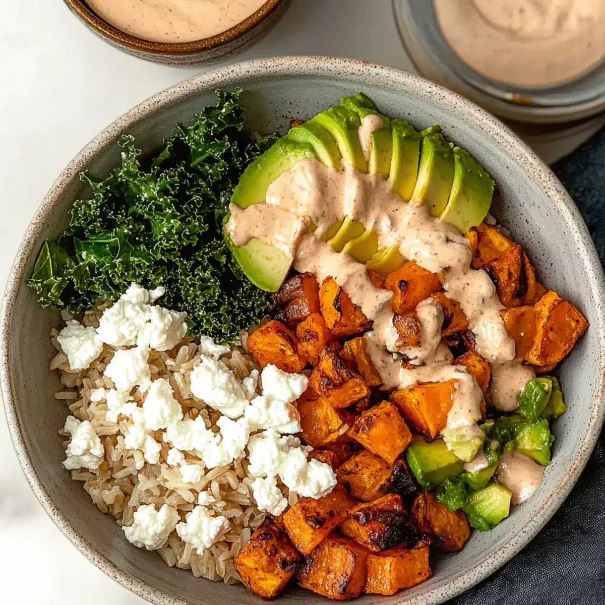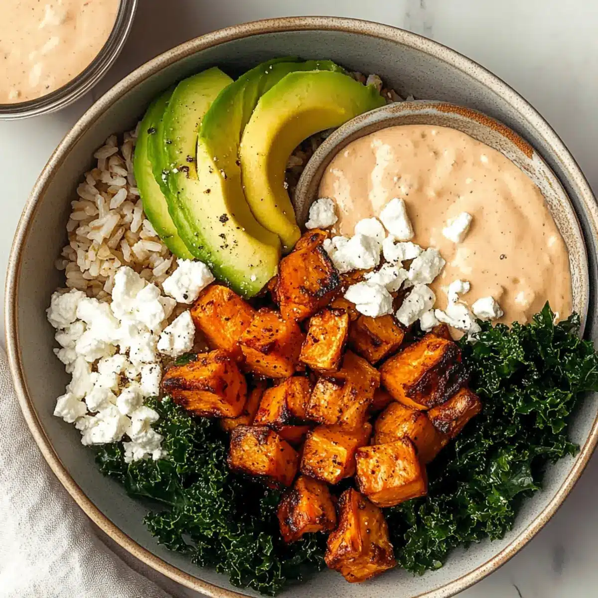Once everything is cooked and ready, it’s time to assemble your Roasted Sweet Potato and Chicken Rice Bowls! Start with a base of cooked brown or white rice in each bowl. Next, layer in the roasted sweet potatoes, tender chicken, and the massaged kale. Finish with slices of avocado, crumbled feta cheese, and a drizzle of your homemade chipotle sauce to elevate the flavors and textures. Enjoy your wholesome creation!