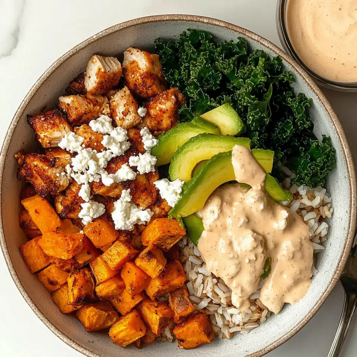 - Assemble bowls with rice, roasted sweet potatoes, chicken, kale, avocado, feta, and chipotle sauce.