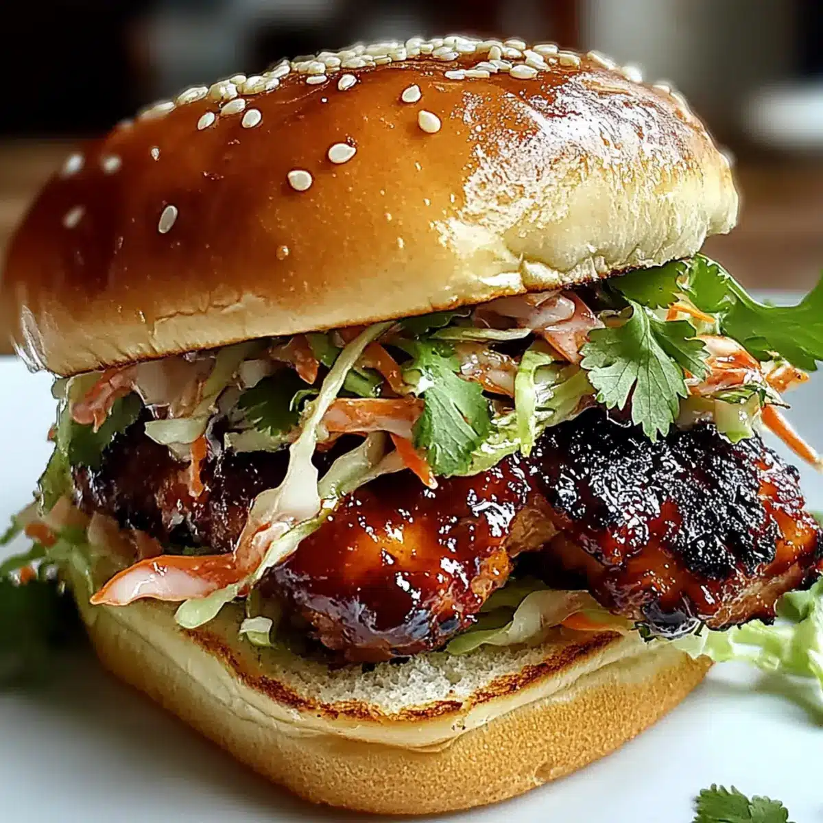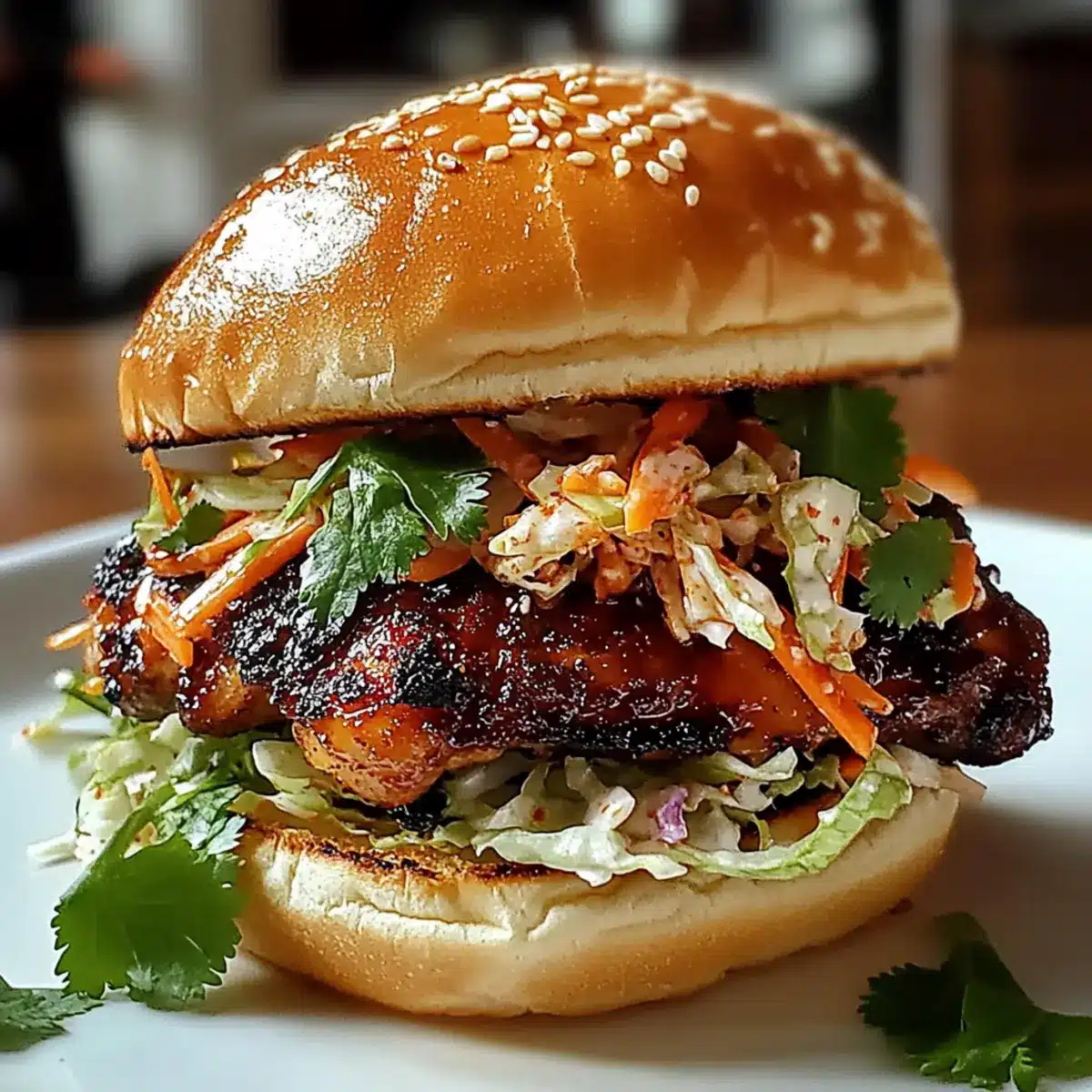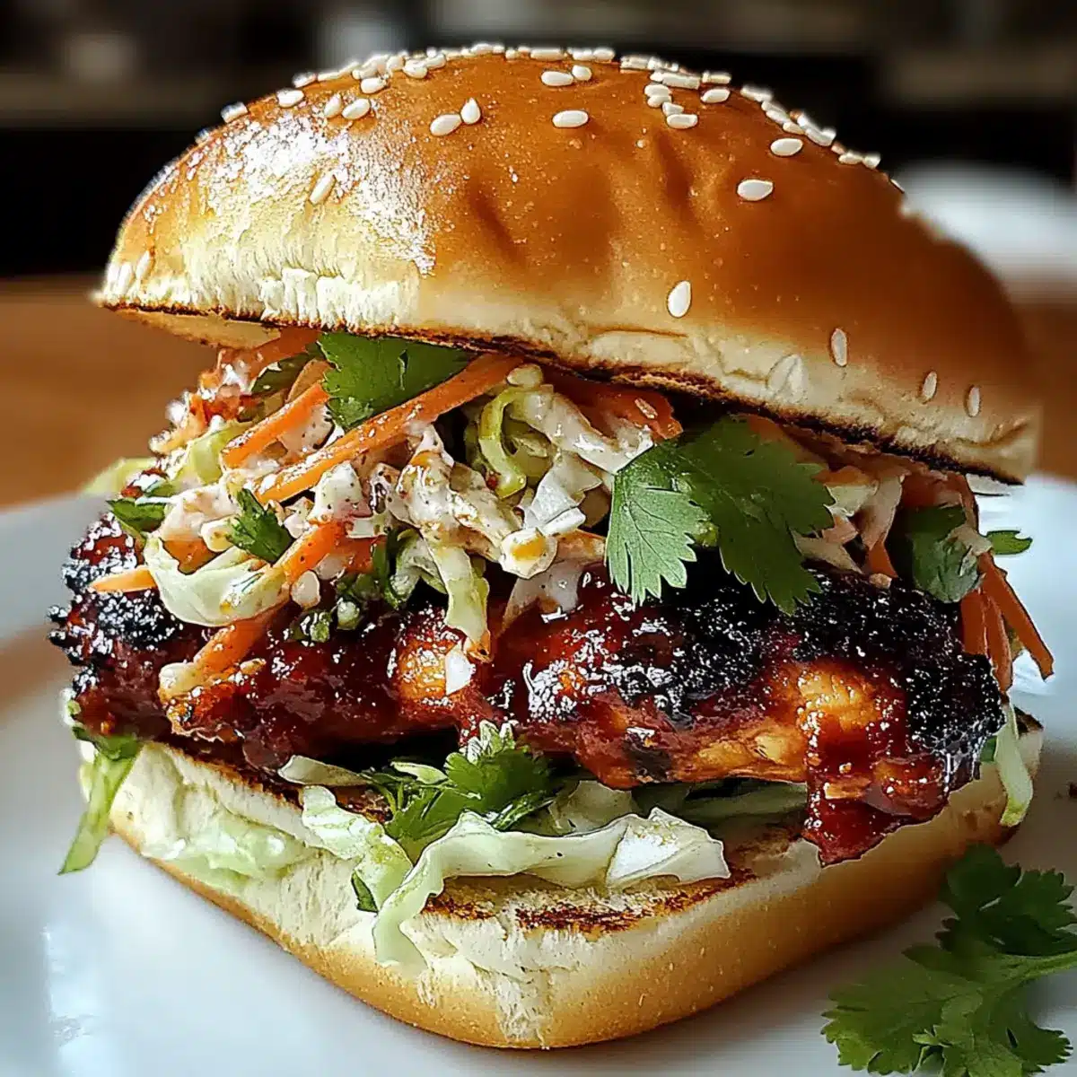 To assemble your sandwich, layer the sliced grilled chicken on the bottom half of each toasted bun. Generously top with the prepared crispy slaw, adding a sprinkle of fresh cilantro and sesame seeds for that extra flavor and crunch. Cap it with the top bun, and your Spicy Korean BBQ Chicken Sandwich is ready to serve!