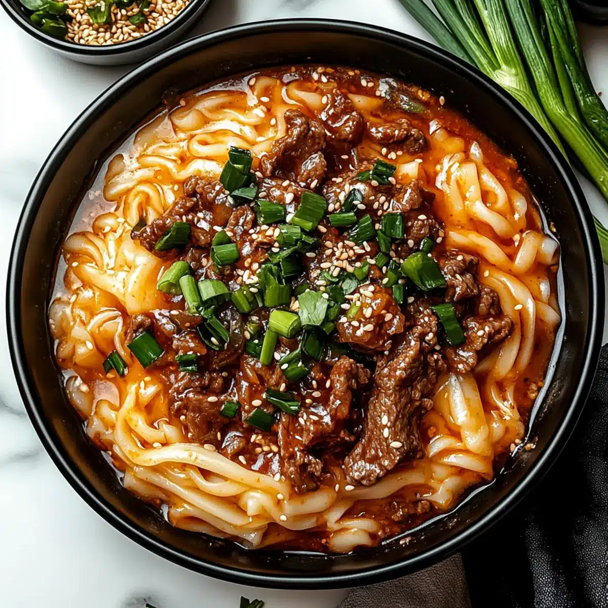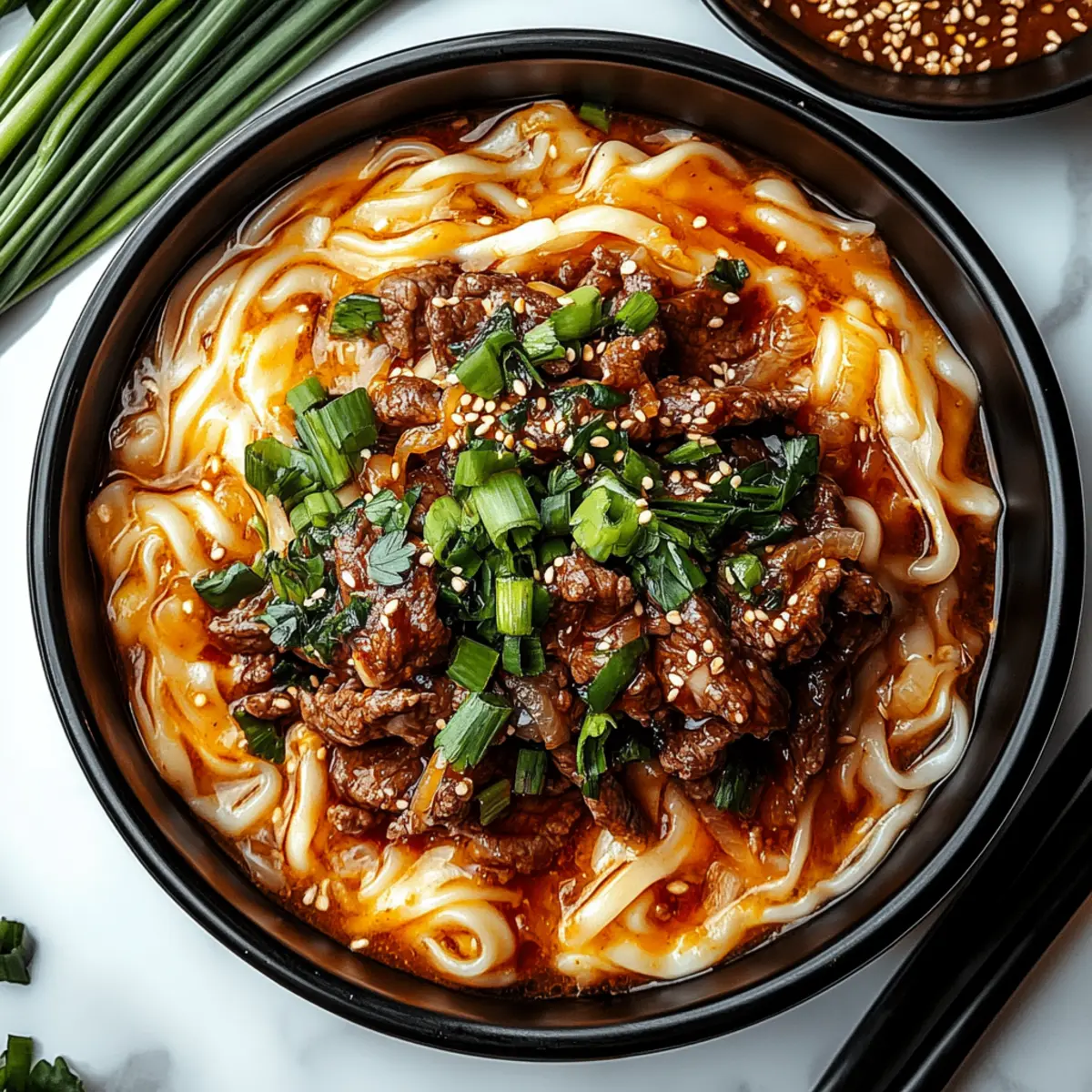 - Remove your Spicy Korean Gochujang Beef Noodles from heat, and serve them hot. Garnish generously with a sprinkle of sesame seeds and sliced green onions for a burst of freshness and color.