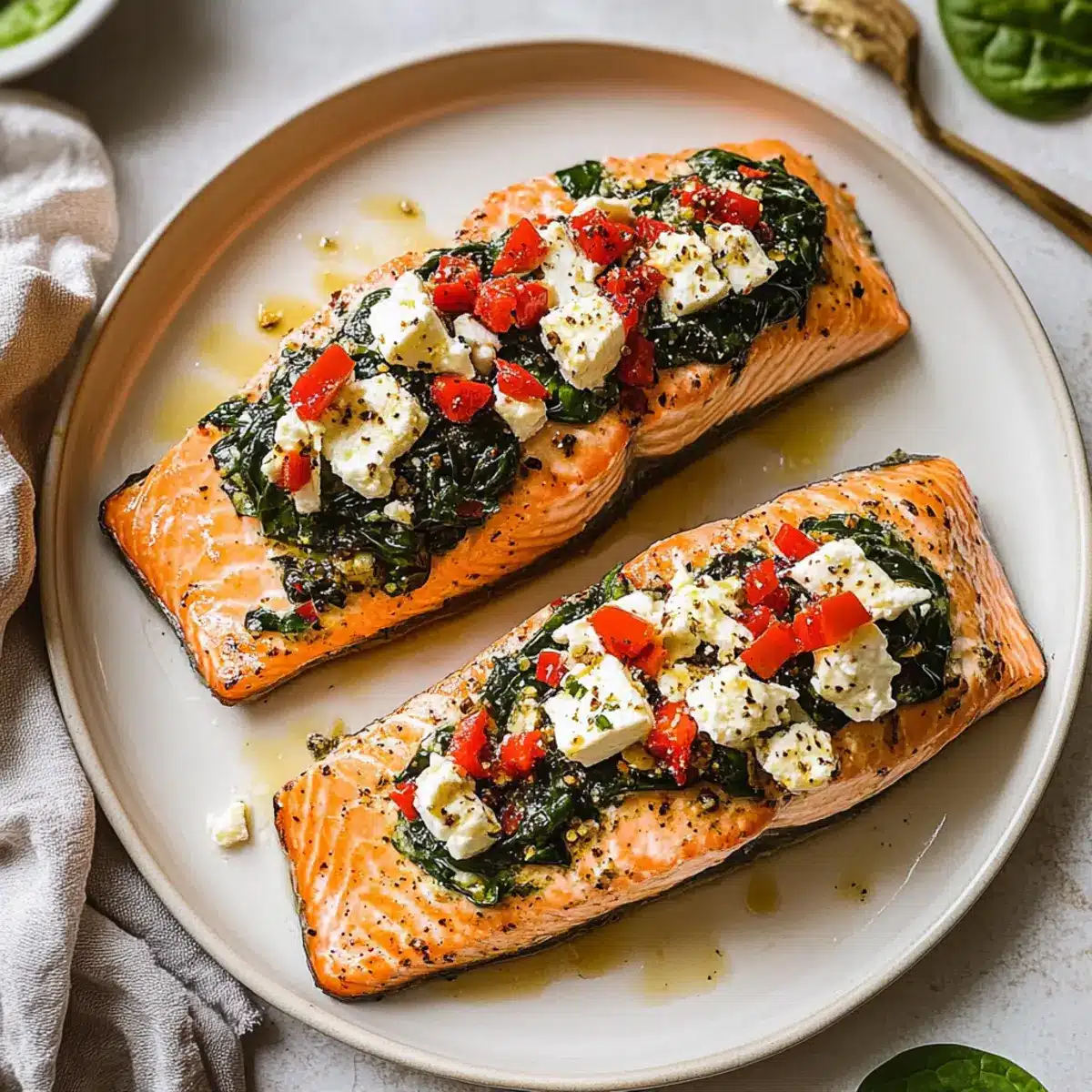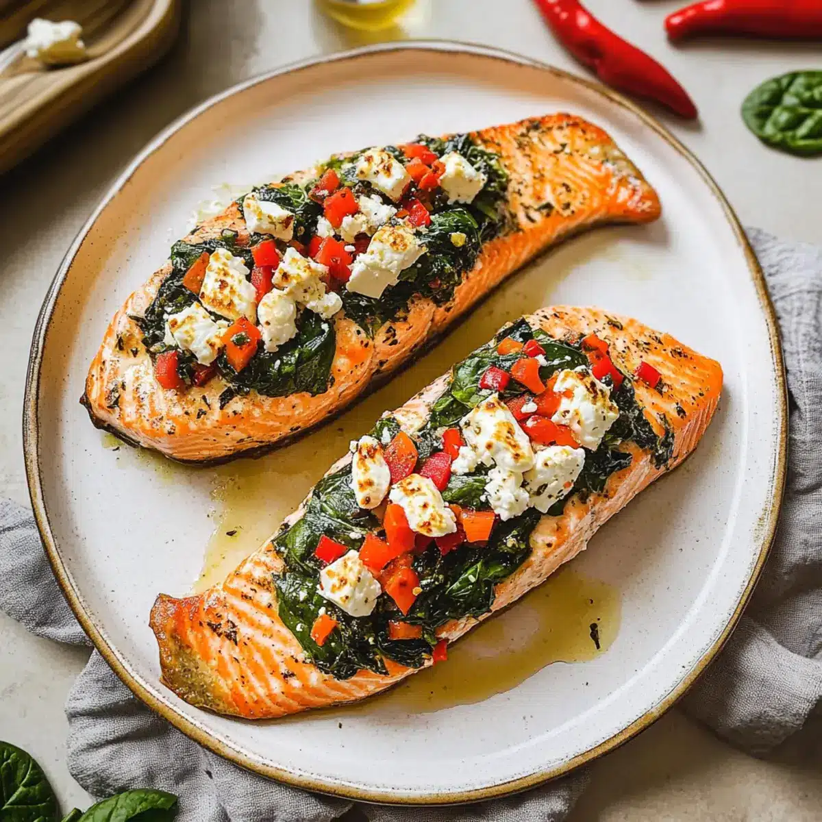 These Spinach and Feta Stuffed Salmon are perfect for busy meal prep enthusiasts! You can prepare the filling—sautéed spinach, feta, roasted red peppers, and seasonings—up to 24 hours in advance by storing it in an airtight container in the refrigerator; this not only saves time but also lets the flavors deepen. When you’re ready to serve, simply slice and stuff the salmon fillets (which can also be seasoned ahead of time), then bake as directed for delicious, restaurant-quality results. If you wish to cook the salmon immediately after stuffing, it can be refrigerated for up to 3 days before baking without sacrificing quality. Enjoy your elegant meal with minimal effort!