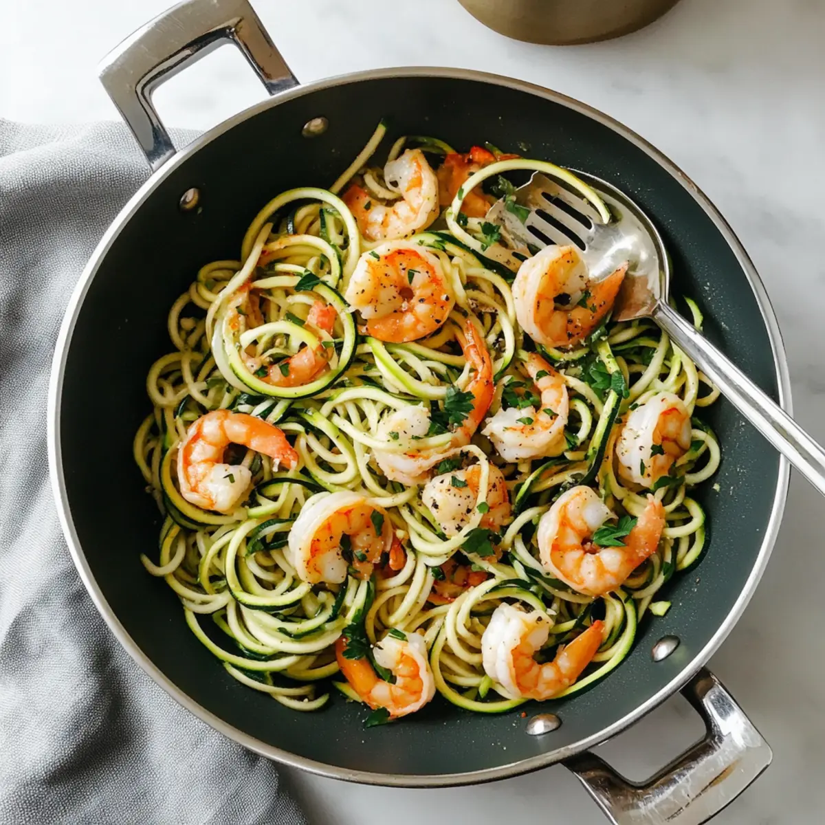 - Add zucchini noodles to skillet, toss gently, then add shrimp back. Mix until heated through.